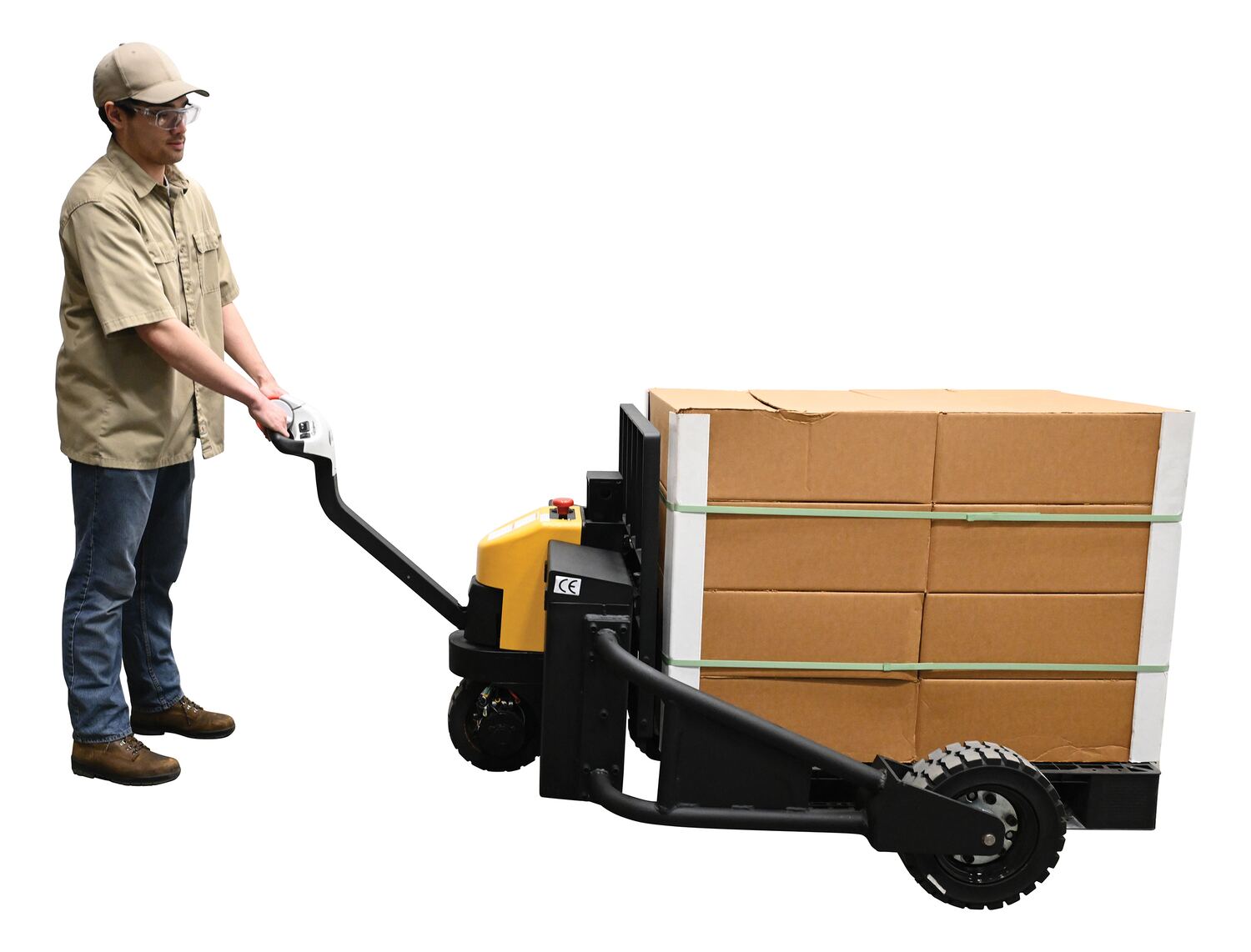 Steel Rough Terrain Electric Pallet Truck DC Powered AC Drive Motor 48 In. Inside Width 2000 Lb. Capacity Black / YellowAn all-terrain pallet truck is the perfect outfit for moving heavy loads over a variety of landscapes. The simple functionality of the unit allows the user to maneuver the truck, both loaded and loaded, easily. Driving handle is centrally located with functions both on and underneath the handle, located directly on the front console. Functions include an easy to operate throttle with infinite adjustment of forward/reverse speeds, lift/lower controls, emergency reverse-function and horn. Emergency reverse belly switch instantly reverses direction and moves the unit forward (away from the operator). Forks are adjustable to best fit the users needs.