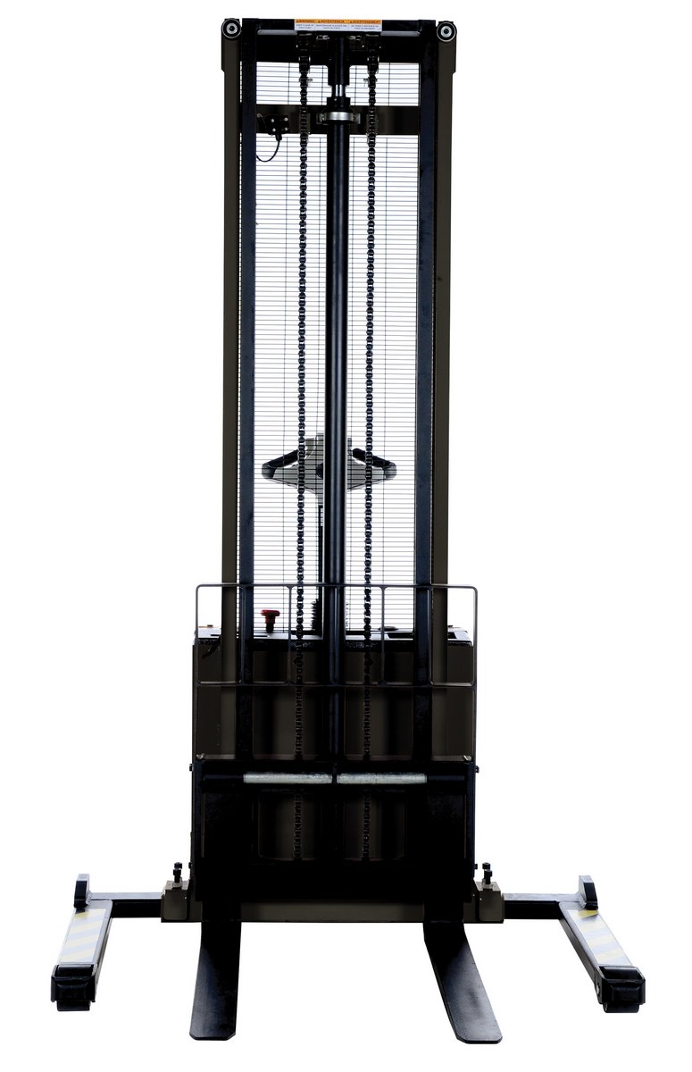 Steel Adjustable Powered Lift Stacker 150 In. Raised Height 2000 Lb. Capacity Black / YellowThe stacker with powered drive and powered lift is a fully powered electric stacker that transports loads throughout warehouse facilities quickly and with less effort. The high torque drive and lift motor handles heavy-duty jobs. The ergonomic handle features easy-to-operate throttle with infinite adjustment of forward and reverse speeds, lift/lower controls, proprietary safety-enhancing emergency reverse function, and horn. When the proprietary safety-enhancing emergency reverse function is actuated, the emergency reverse belly switch instantly reverses direction and moves the unit forward (away from the operator) until the switch is released or after five seconds have elapsed. The built-in safety circuit will automatically disable the entire unit if the emergency reverse belly switch is activated for more than five (5) seconds after which the unit must be re-set to return to normal operating conditions. This state-of-the-art safety device provides a high degree of operator protection. It includes an electromagnetic disc brake with automatic dead-man feature that activates when user releases the handle. The power lifter features a lead acid deep cycle battery, integral battery charger, and a battery level gauge. Horn included. The stacker rolls smoothly on poly-on-steel steer and load wheels.