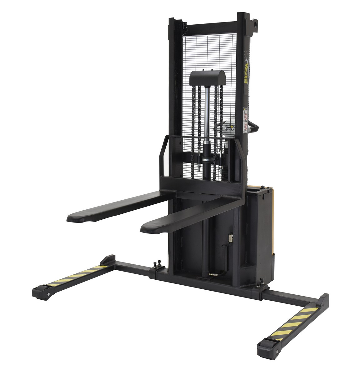 Steel Fixed Fork Lift Stacker 62 In. Raised Height 2,000 Lb. Capacity Black / YellowThe stacker with powered drive and powered lift is a fully powered electric stacker that transports loads throughout warehouse facilities quickly and with less effort. The high torque drive and lift motor handles heavy-duty jobs. The ergonomic handle features easy-to-operate throttle with infinite adjustment of forward and reverse speeds, lift/lower controls, proprietary safety-enhancing emergency reverse function, and horn. When the proprietary safety-enhancing emergency reverse function is actuated, the emergency reverse belly switch instantly reverses direction and moves the unit forward (away from the operator) until the switch is released or after five seconds have elapsed. The built-in safety circuit will automatically disable the entire unit if the emergency reverse belly switch is activated for more than five (5) seconds after which the unit must be re-set to return to normal operating conditions. This state-of-the-art safety device provides a high degree of operator protection. It includes an electromagnetic disc brake with automatic dead-man feature that activates when user releases the handle. The power lifter features a lead acid deep cycle battery, integral battery charger, and a battery level gauge. The stacker rolls smoothly on poly-on-steel steer and load wheels.