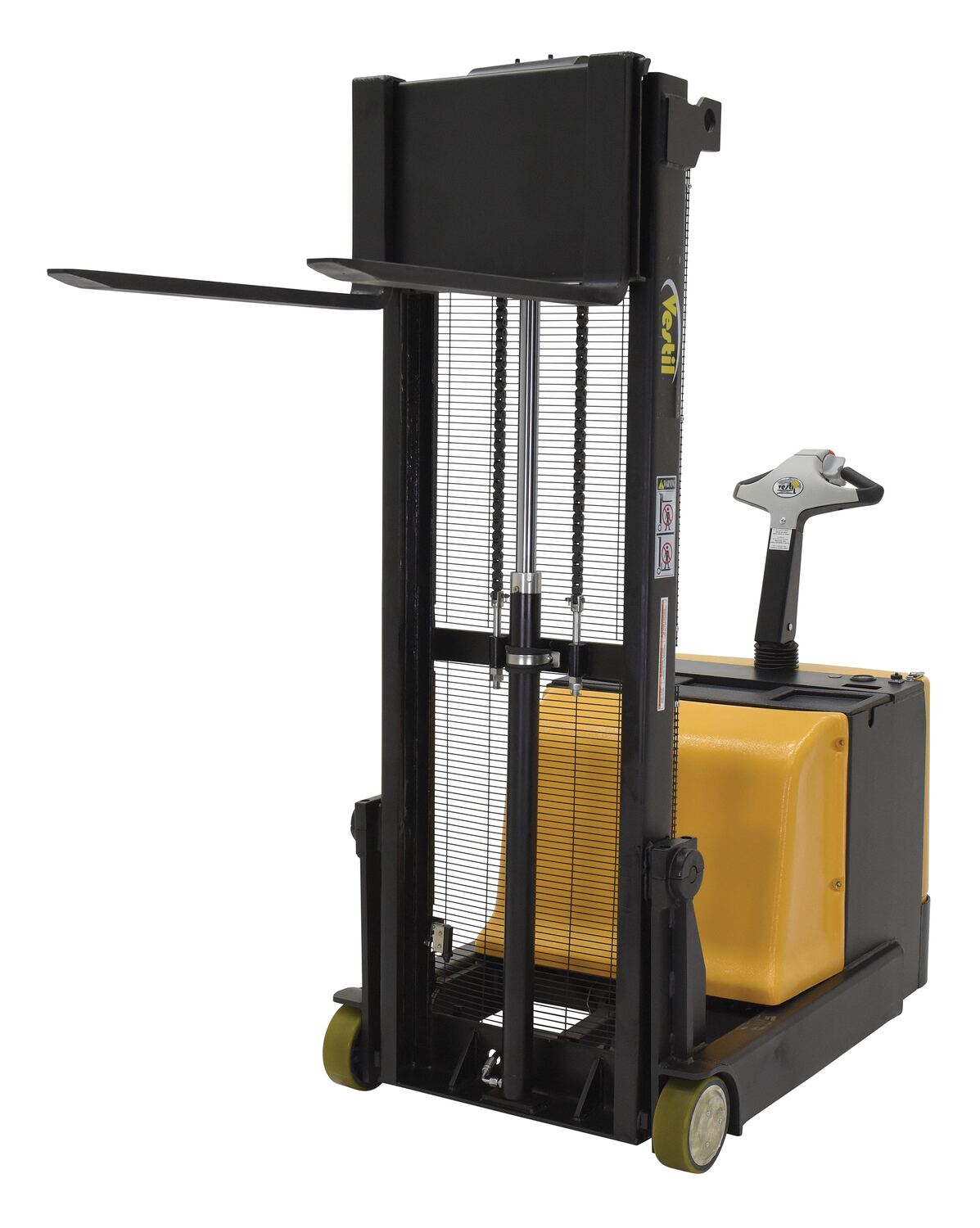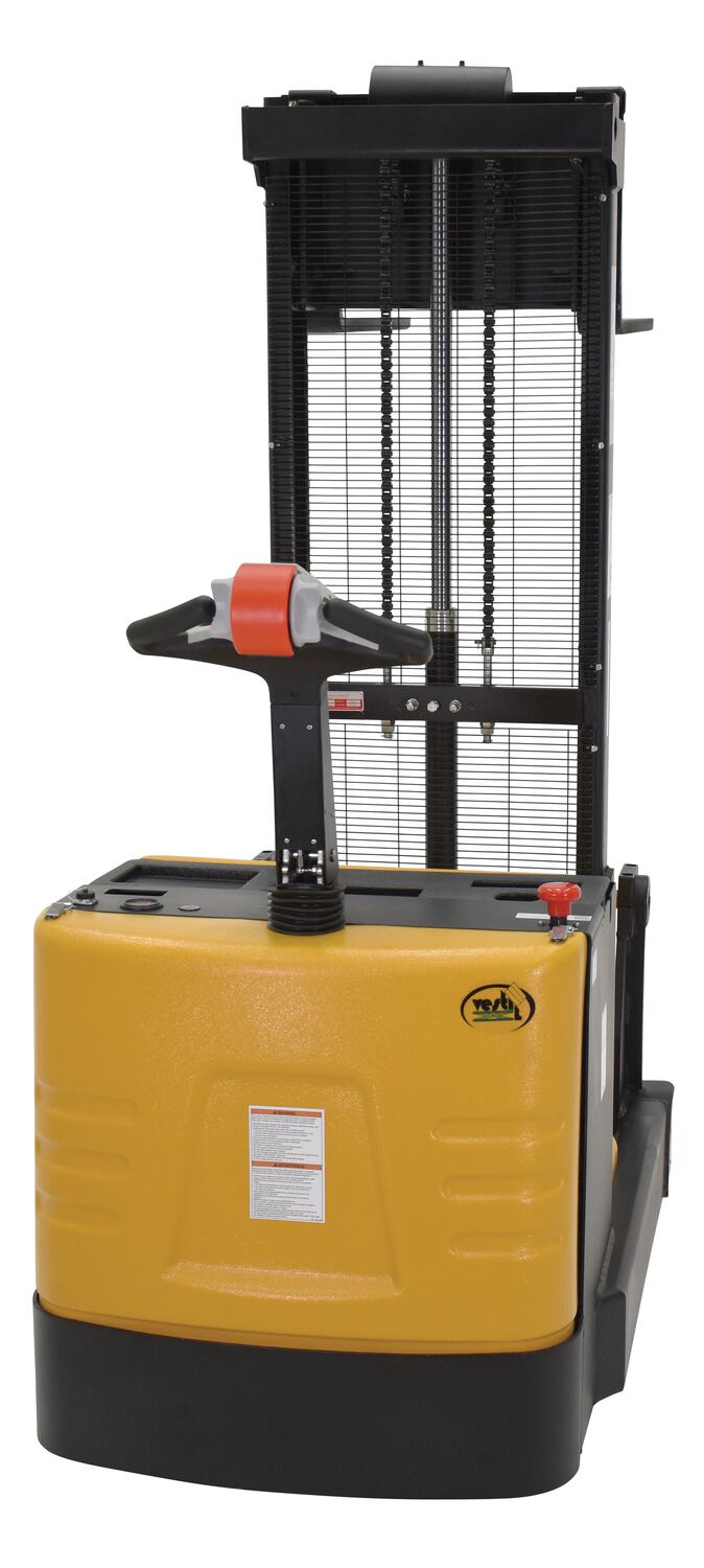 Steel Counter Balanced Powered Lift 2 In. to 62 In. Raised Height 1,000 Lb. Capacity Black / YellowThe counter-balanced power drive lift is ideal for die loading, machine feeding, and for loading and unloading trucks. The high torque drive and lift motor handles heavy-duty jobs. The ergonomic handle features an easy-to-operate throttle with infinite adjustment of forward and reverse speeds, lift/lower controls, proprietary safety-enhancing emergency reverse function, and horn. When the proprietary safety-enhancing emergency reverse function is actuated, the emergency reverse belly switch instantly reverses direction and moves the unit forward (away from the operator) until the switch is released or after five (5) seconds have elapsed. The built-in safety circuit will automatically disable the entire unit if the emergency reverse belly switch is activated for more than five (5) seconds after which the unit must be re-set to return to normal operating conditions. This state-of-the-art safety device provides a high degree of operator protection. Includes an electromagnetic disc brake with automatic dead-man feature that activates when the user releases the handle. The powered lift has lead acid deep cycle batteries, an integral battery charger, and battery level gauge. The stacker rolls smoothly on poly-on-steel steer & load wheels. The high level of serviceability simplifies maintenance and prolongs equipment life. The forks adjust to suit different pallets and the easy access battery compartment simplifies battery maintenance. Horn included.