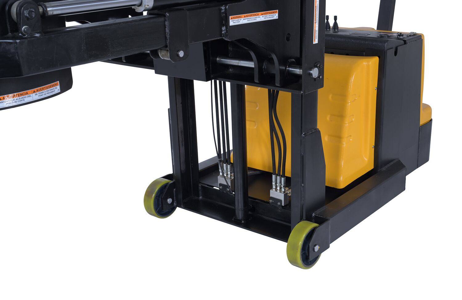 The fully powered vertical drum gripper/rotator is a great asset for the manufacturing and distributing industries. The shortened length allows for use in very tight areas, while the extendable reach helps load and unload places where access is limited, such as pallets and skids. A walk behind design with a max unloaded speed of over 3 mph and a single handle control makes maneuvering into the desired position easy, maximizing efficiency. Long term battery charge allows for constant daily use without needless downtime.