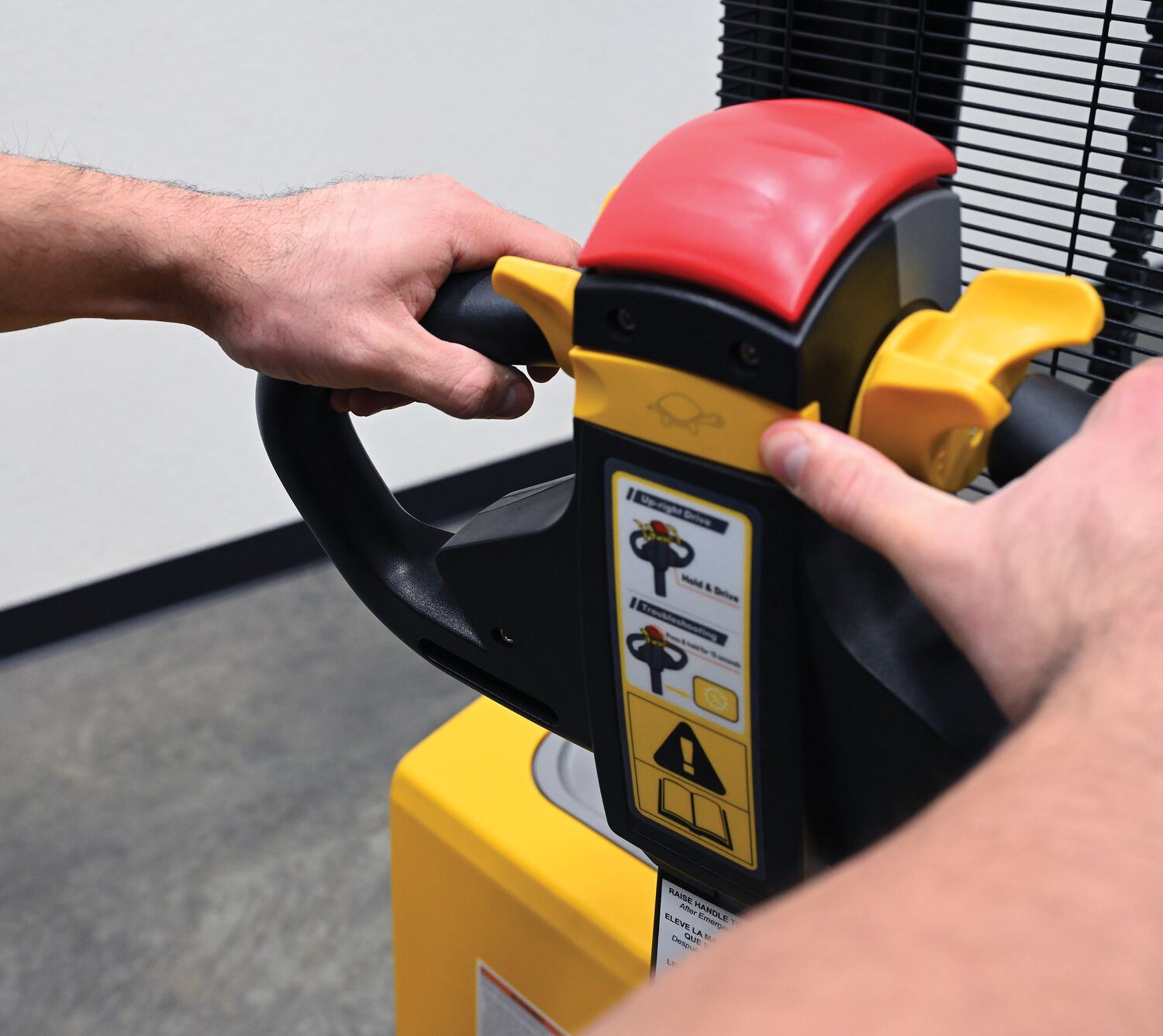The double mast fully powered electric stacker transports loads throughout warehouse facilities quickly and with less effort. High torque drive and lift motor handles heavy duty jobs. Ergonomic handle features lift/lower controls, proprietary safety enhancing emergency reverse function, and horn. The unit includes an electromagnetic disc brake with automatic dead-man feature. Powered lifter has two 12V lead acid deep cycle batteries, integral battery charger, and a battery level gauge.