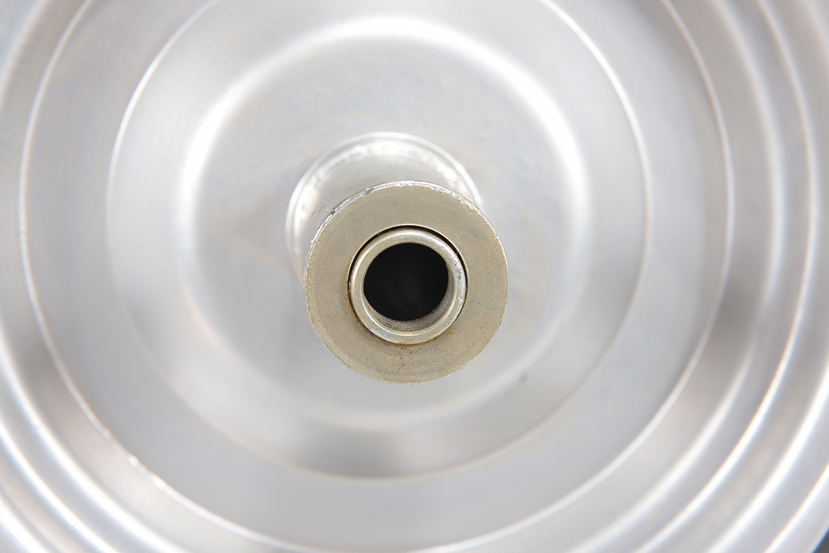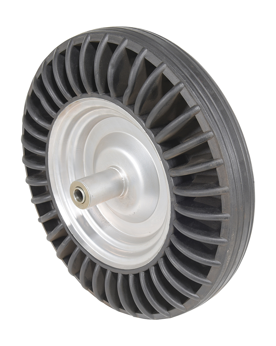 This shock-absorbing wheel with special design for shock absorption properties prevents wheels from bouncing like standard pneumatic wheels. Solid black molded rubber tread will never go flat. Steel hubs (symmetric style for wheel barrels) for maximum strength and precision bearings.