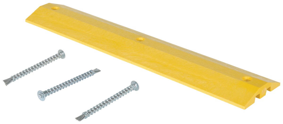 Plastic Speed Bump Heavy Duty Asphalt Hardware 48 In. x 10 In. x 2 In. YellowThe speed bump is ideal for a variety of parking areas, both inside and out. The speed bump helps to control drivers from injuring people and property. The unit can be installed/removed by one person resulting in smooth portability. The strong recycled plastic construction can be used where traffic is frequent and can hold up to the constant day to day harm from chemicals and sunlight. Features a dual cable channel. The HD asphalt kit includes anchors, bolts and washers. The HD anchor should be epoxied (epoxy not included) into the ground and then the speed bump is secured to that anchor with a bolt and washer.