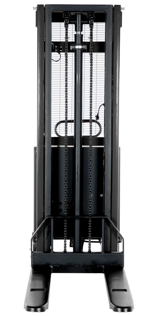 Steel Fixed Stacker with Powered Lift 118 In. Raised Height 2,000 Lb. Capacity Black / YellowThe stacker powered lift is a semi-electric stacker with a powered lift that will raise and lower loads quickly and easily. The manual push operation stacker is made using high quality material and parts. The stacker is easily maneuvered using the standard pulling handle. The stacker is highly efficient and durable. It features an integral battery charger and battery level gauge. The unit works with skids only and features fixed forks along with fixed support legs.