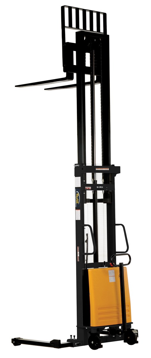 Steel Adjustable Stacker with Powered Lift 137 In. Raised Height 2,000 Lb. Capacity Black / YellowThe stacker powered lift is a semi-electric stacker with a powered lift that will raise and lower loads quickly and easily. The manual push operation stacker is made using high quality material and parts. The stacker is easily maneuvered using the standard pulling handle with adjustable forks and adjustable support legs. The stacker is highly efficient and durable while working with pallets or skids. It features an integral battery charger and battery level gauge.