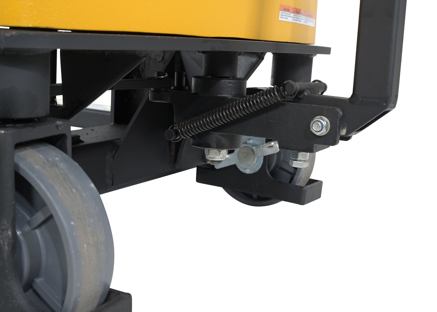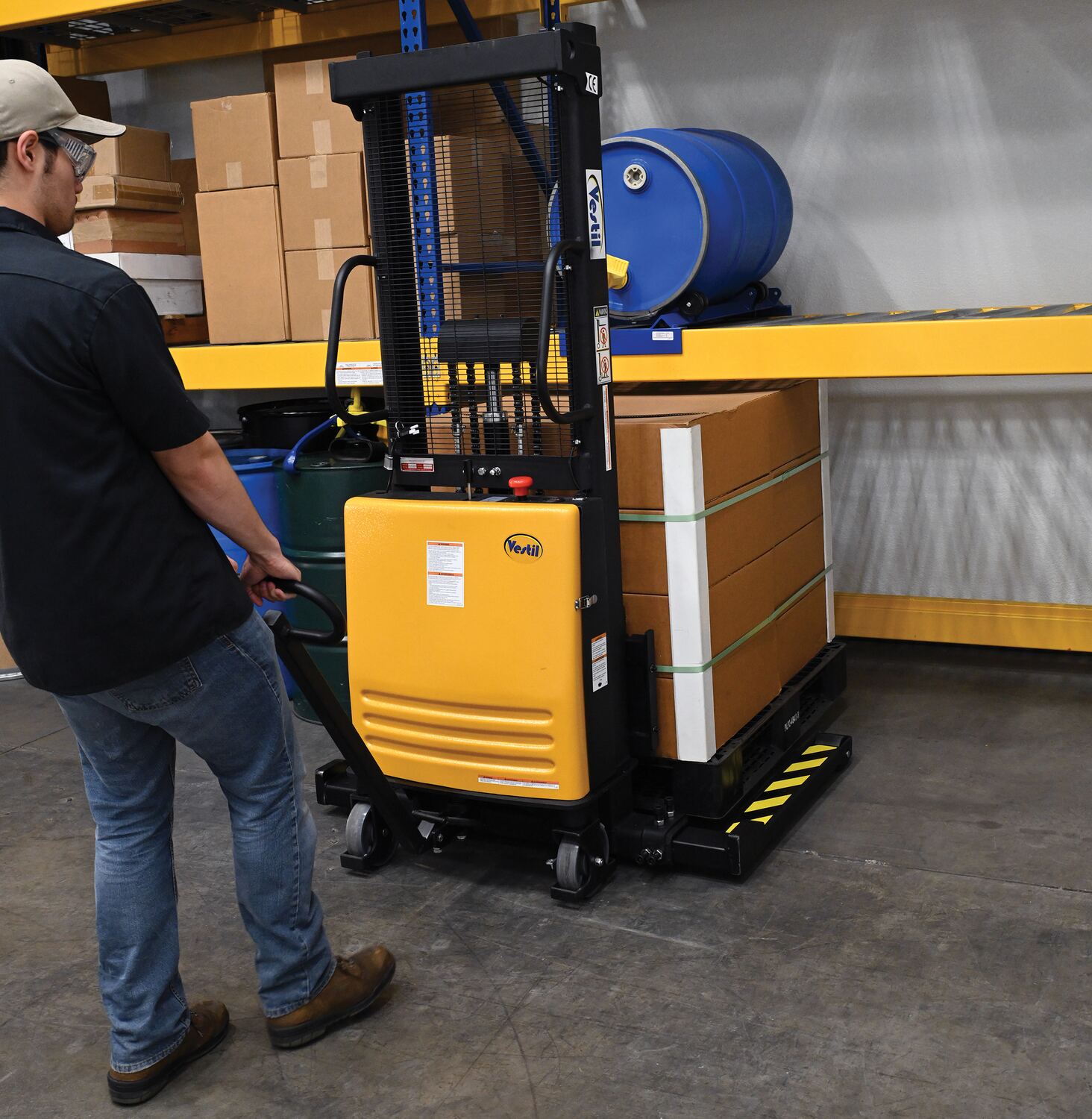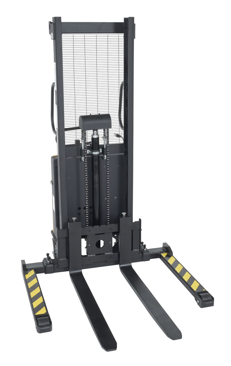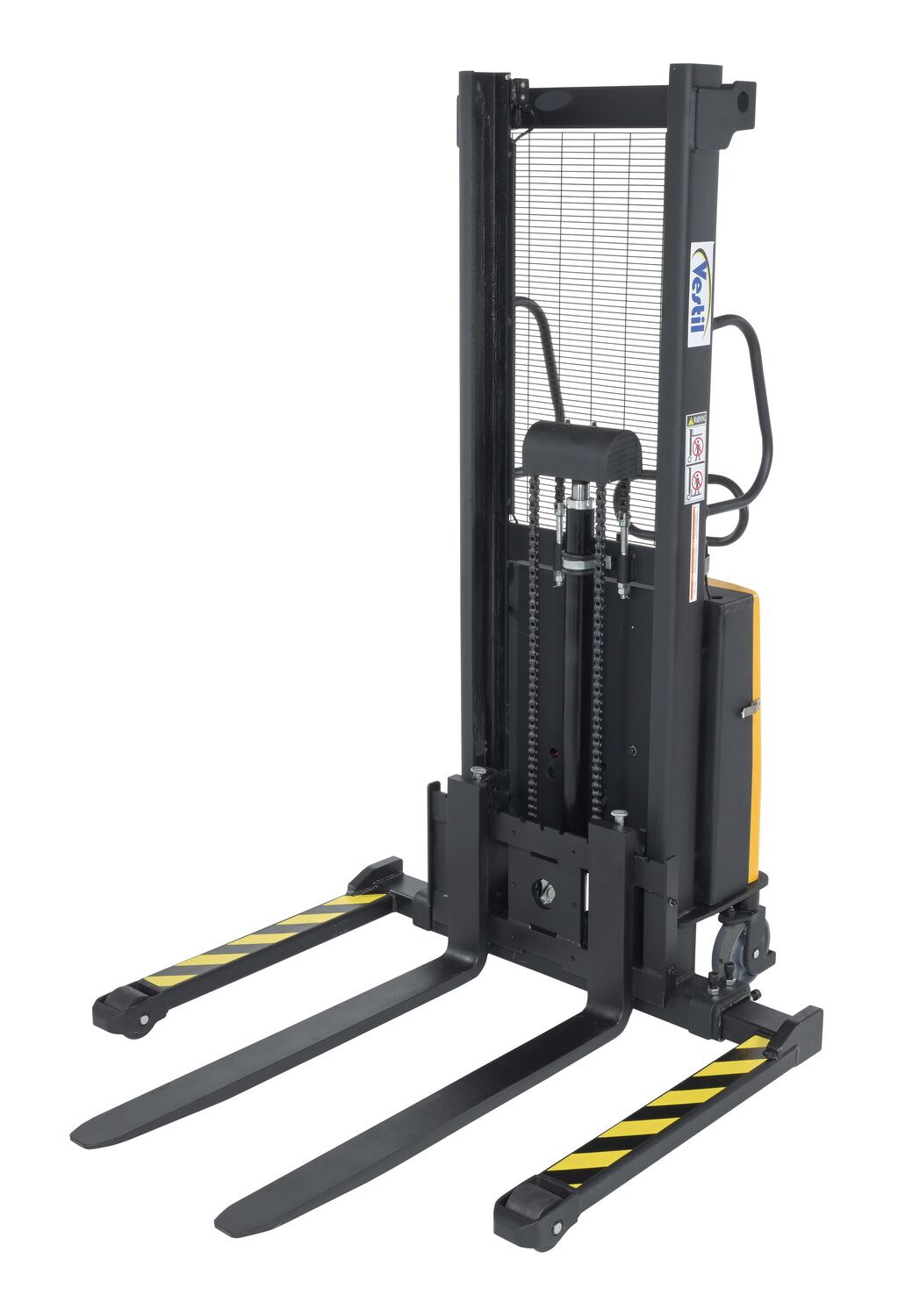 Steel Adjustable Stacker with Powered Lift 63 In. Raised Height 2,000 Lb. Capacity Black/YellowThe stacker powered lift is a semi-electric stacker with a powered lift that will raise and lower loads quickly and easily. The manual push operation stacker is made using high quality material and parts. The stacker is easily maneuvered using the standard pulling handle with adjustable forks and adjustable support legs. The stacker is highly efficient and durable while working with pallets or skids. It features an integral battery charger and battery level gauge.