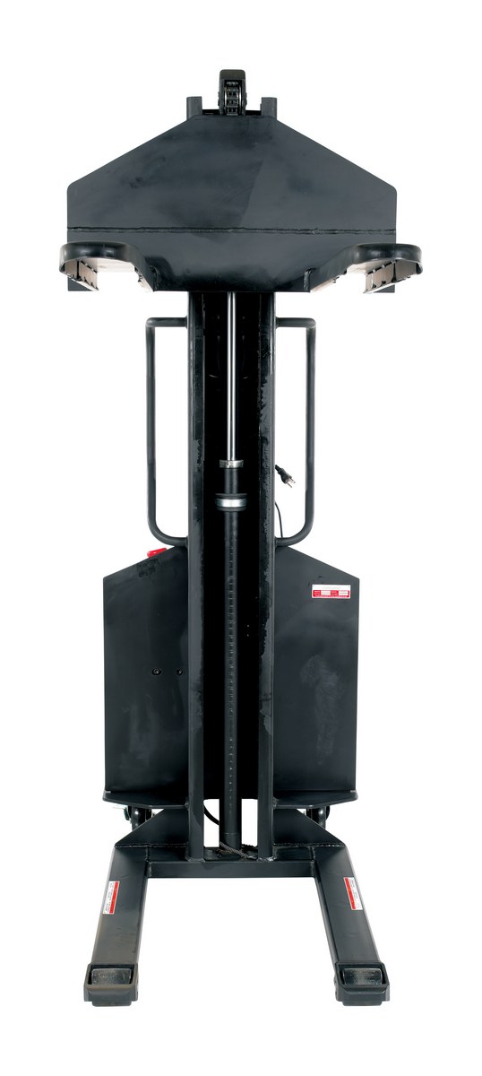 Steel Narrow Mast Stacker DC Powered 63 In. Raised Height Fixed Forks 45-1/4 In. Fork Length 1,500 Lb. Capacity YellowThe narrow mast stacker is great for the shipping and manufacturing facilities. The stacker provides a fast efficient solution to loading and unloading products in closely confined areas. The unit features a simple push button design for lifting control, nylon steering and load wheels for excellent maneuverability, and a battery charger and gauge. Models are available with fixed or adjustable forks as well as fixed or adjustable leg supports.