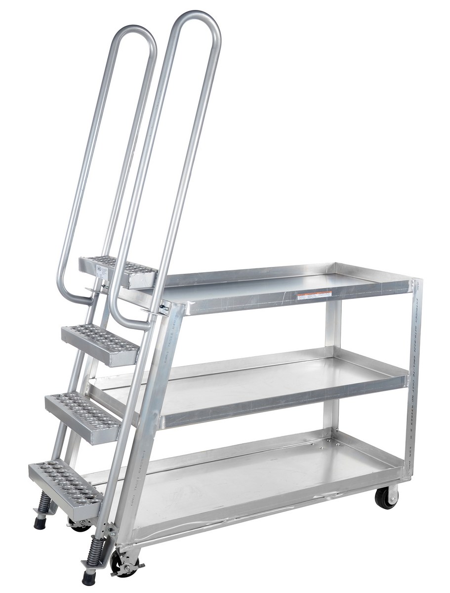 Aluminum High Duty Stock Picker Truck with Steel Ladder 56 In x 21-7/8 In x 73-5/16 In 500 Lb. CapacityThis oversized hi-duty stock picker truck is perfect for large jobs. Ideal for oversized cartons, boxes, parts, and supplies. A spring loaded steel ladder for sure, safe climbing, and loading. Steps have non-skid footing with self-cleaning surface. Each unit features three (3) shelves. Ladders have a baked in silver powder coated finish.