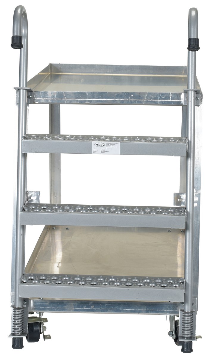 Aluminum Stock Picker with Steel Ladder 52 In. x 27-7/8 In. x 50-3/16 In. 660 Lb. CapacityCombine the mobility of a cart with the versatility of a step ladder with this stock picker truck. Convenient spring loaded steel step ladder holds the cart securely in place while a person is standing on the ladder. Crutch tip ladder prevents the cart from moving while stocking. Springs then return the ladder to the raised position once personnel exit the step. All shelves have the lip turned up to prevent items from falling off. Ladders have a baked in silver powder coated finish.