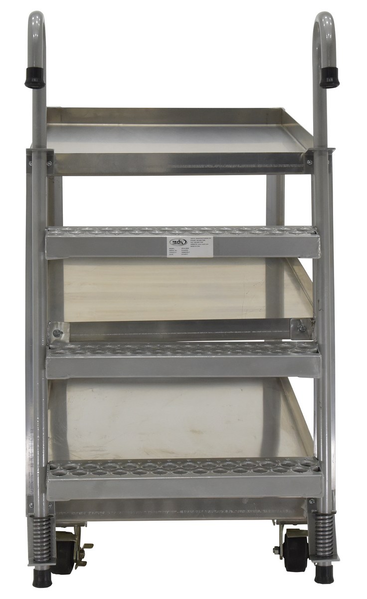 Combine the mobility of a cart with the versatility of a step ladder with this stock picker truck. Convenient spring loaded steel step ladder holds the cart securely in place while a person is standing on the ladder. Crutch tip ladder prevents the cart from moving while stocking. Springs then return the ladder to the raised position once personnel exit the step. All shelves have the lip turned up to prevent items from falling off. Ladders have a baked in silver powder coated finish.
