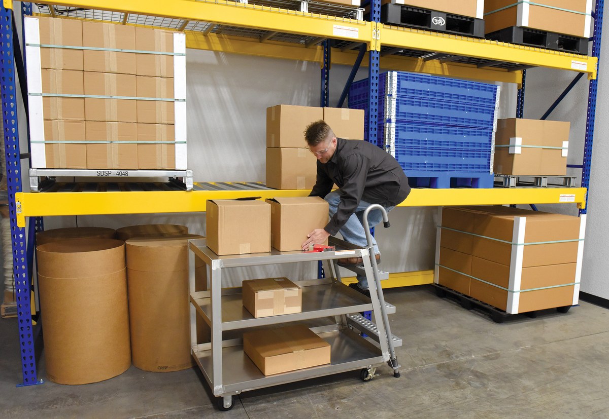 Aluminum Stock Picker with Steel Ladder 52 In. x 27-7/8 In. x 50-3/16 In. 1000 Lb. CapacityCombine the mobility of a cart with the versatility of a step ladder with this stock picker truck. Convenient spring loaded steel step ladder holds the cart securely in place while a person is standing on the ladder. Crutch tip ladder prevents the cart from moving while stocking. Springs then return the ladder to the raised position once personnel exit the step. All shelves have the lip turned up to prevent items from falling off. Ladders have a baked in silver powder coated finish.