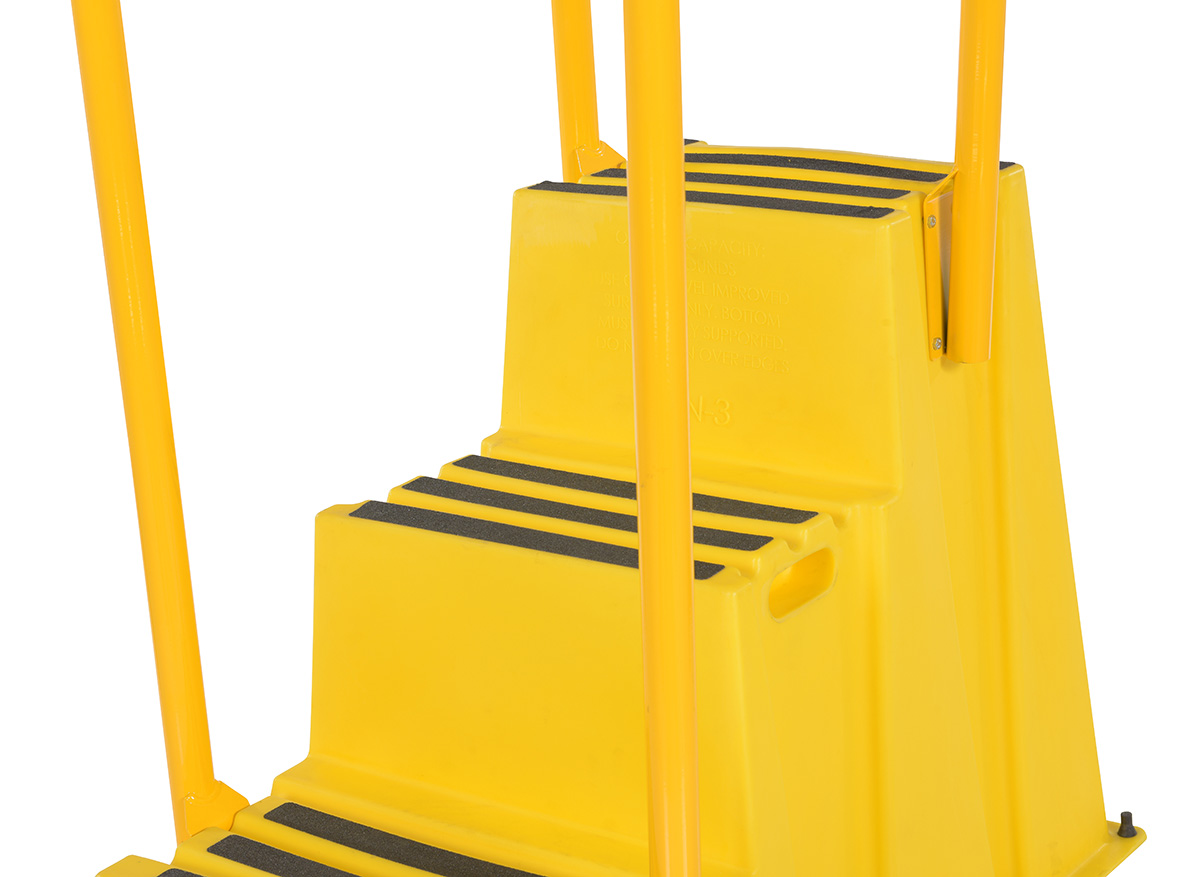 Polyethylene Nestable with Hand and Back Rails Casters 3 Step 500 Lb. Capacity YellowA poly step stool is a great asset for on the go or in a permanent setting. A lightweight design with front and side cutout handles, allow the user to easily transfer the stool to a preferred spot. The taped step surfaces ensure safe footing while traversing up and down the steps. Includes bolt on back rail, handrail, and casters. The hand rails height allows the unit to be pushed or pulled into the desired position, minimizing bending and twisting by the user. Steps can be nested to minimize footprint when not in use.