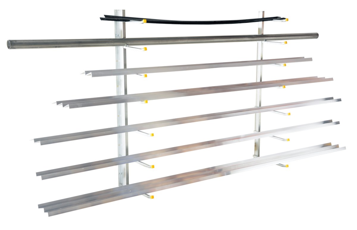 This economical material rack is a wall mounted unit with dual supports. It comes with three (3) long arms and four (4) short arms. The bright zinc plating provides a long term, attractive appearance.