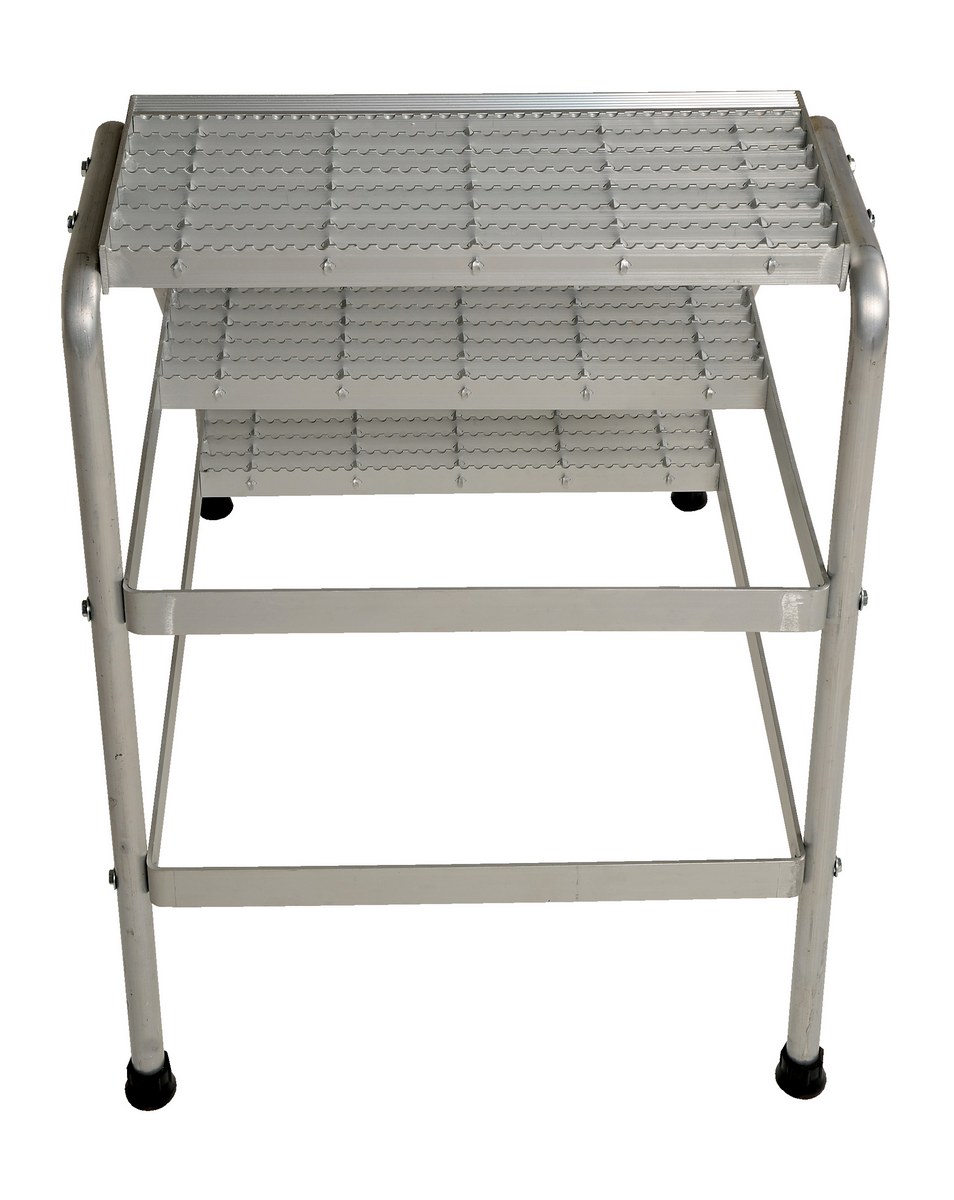 Aluminum 3 Step Knock Down Stand 500 Lb. Capacity SilverThis Aluminum step stand is ideal for industrial or commercial applications. It is lighter than comparable steel models. Open step design includes extra heavy duty serrated surface for traction. With rubber tipped legs, this step ladder is ideal for use on many types floors.