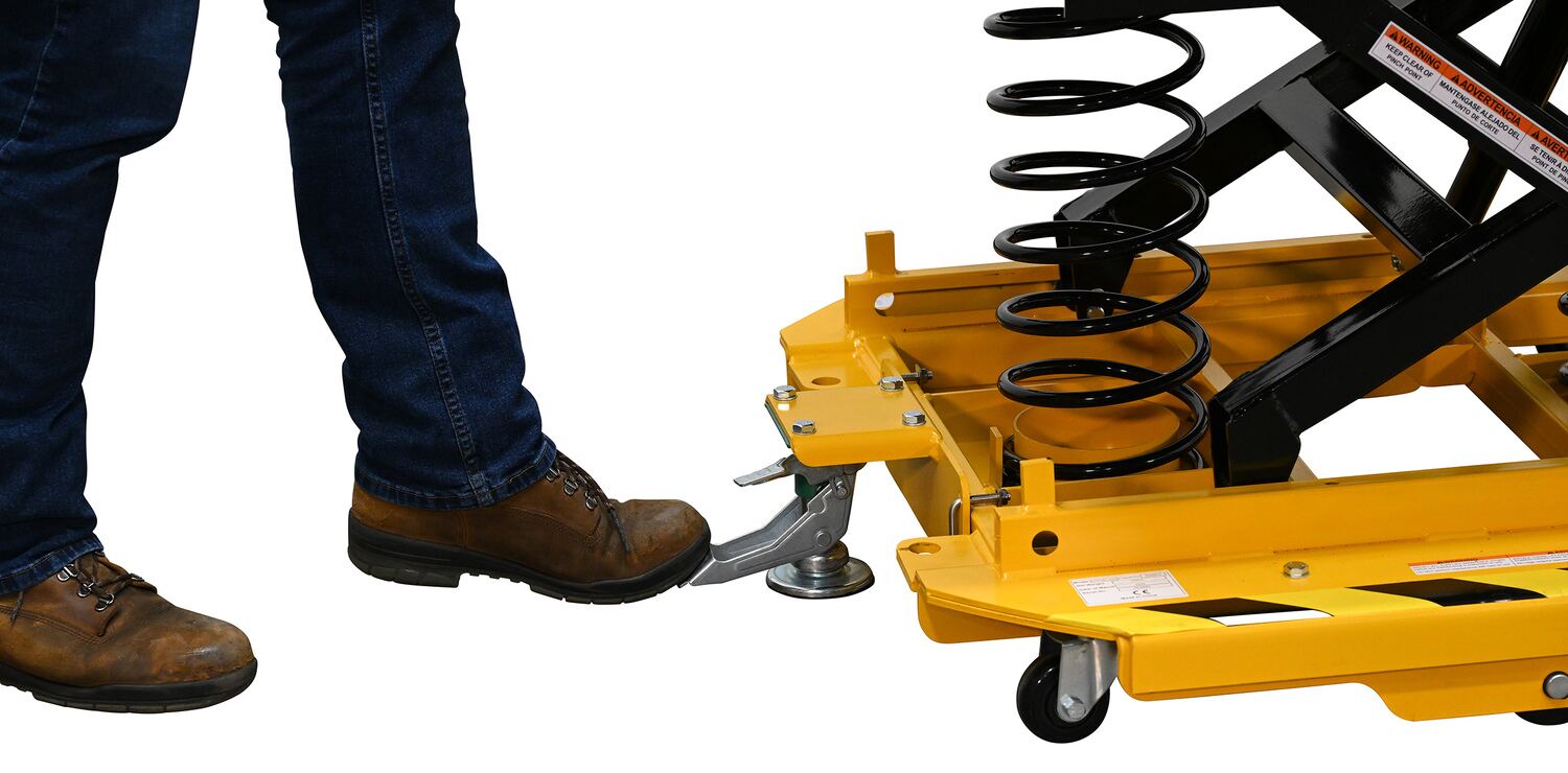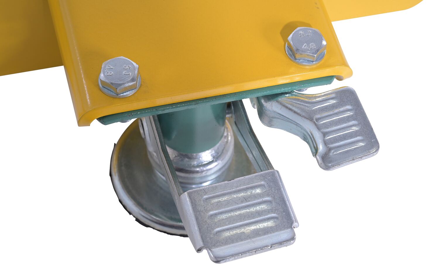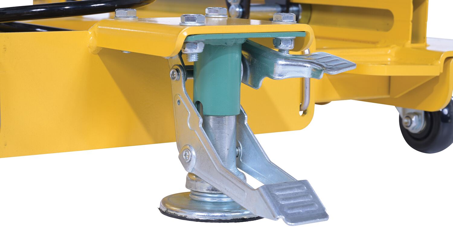 Spring Scissor Table Glass Filled Nylon Caster Kit Option 4,500 Lb. Capacity YellowTurning a stationary spring loaded table into a portable one has never been easier. With the caster kit option, the table can now be wheeled around the workplace without the needed of additional lifting equipment. The casters are attached to individual steel pieces which are then secured to the fork pockets of the existing spring loaded table. A floor brake is also included to maintain stability during loading and unloading.