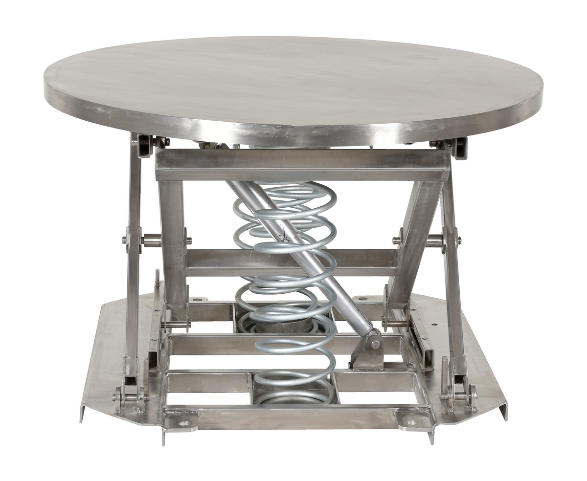 Partially Stainless Steel Solid Manual Carousel Top Spring Scissor Table 4,500 Lb. Capacity SilverThe spring scissor table is ideal for distributing and shipping facilities. The unit allows the user to transfer products from work space to work space, while holding an ergonomically friendly position. The frame is designed of a stainless steel construction, which allows for strength, durability, and a long lifespan. The scissor mechanism raises the unit to the desired height, while the internal spring provides support when unit is being loaded and unloaded. The round top can be manually rotated 360 degrees for improved packaging and handling capabilities.