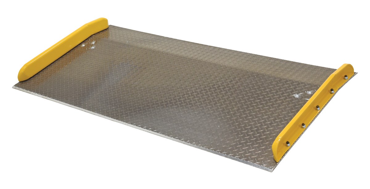 Aluminum Dock Board Steel Curb 72 In. x 36 In. 10,000 Lb. Capacity SilverThe Aluminum truck dock board with steel safety curbs is designed for portability and safety. The deck is made of tough high strength aluminum tread plate. The edges are beveled for smooth entry and exit. Safety curbs are coated yellow and are constructed of steel with cast tapered ends. Steel legs are bolted on for increased durability. Canted locking legs for easier truck portability. Manufactured in compliance with OSHA. The capacity is based upon the heaviest type of equipment used plus the maximum load carried times the single axle rating of total load. Dynamic loading, driver tendencies, speed and frequency of use must be considered. When using three-wheeled fork trucks order dock board with capacity at least four-times the lifting capacity of fork truck. The width of the dock board should be at least fifteen (15) inches wider than the load or equipment passing between the curbs. If the load does not pass between curbs, but is elevated above, add fifteen (15) inches to overall width of equipment.