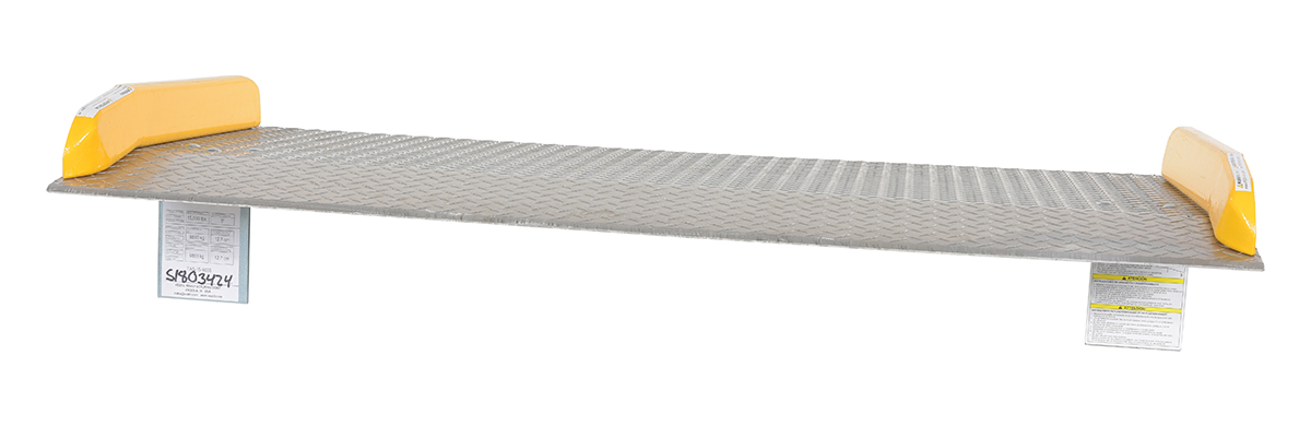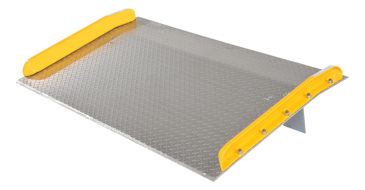 Aluminum Dock Board Steel Curb 60 In. x 36 In. 15,000 Lb. Capacity SilverThe Aluminum truck dock board with steel safety curbs is designed for portability and safety. The deck is made of tough high strength aluminum tread plate. The edges are beveled for smooth entry and exit. Safety curbs are coated yellow and are constructed of steel with cast tapered ends. Steel legs are bolted on for increased durability. Canted locking legs for easier truck portability. Manufactured in compliance with OSHA. The capacity is based upon the heaviest type of equipment used plus the maximum load carried times the single axle rating of total load. Dynamic loading, driver tendencies, speed and frequency of use must be considered. When using three-wheeled fork trucks order dock board with capacity at least four-times the lifting capacity of fork truck. The width of the dock board should be at least fifteen (15) inches wider than the load or equipment passing between the curbs. If the load does not pass between curbs, but is elevated above, add fifteen (15) inches to overall width of equipment.