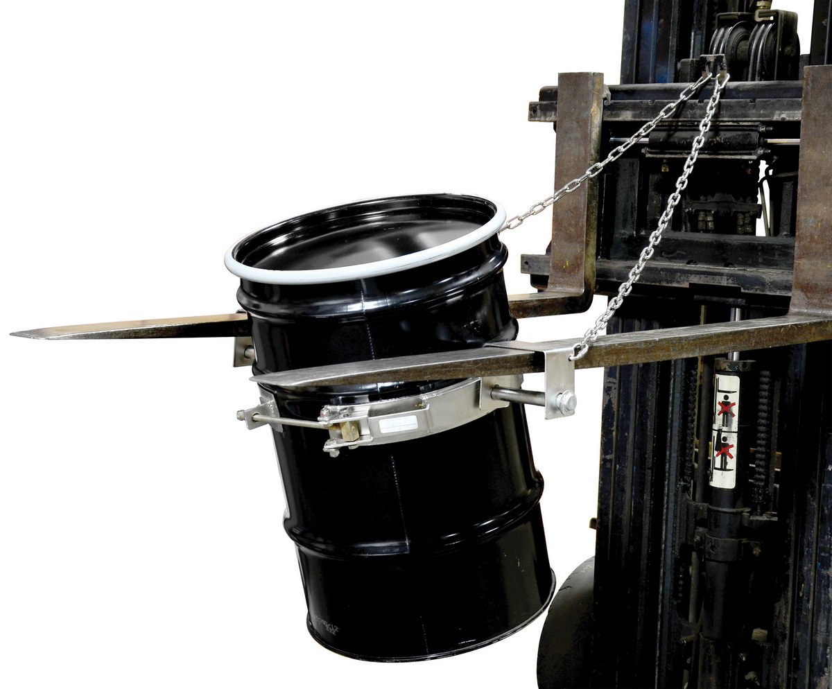 Easily transport steel drums with your fork truck and the tilting drum ring. Pivoting fork pockets allow you to manually rotate drum to dispense light materials. To use, slip the band over the belly of the steel drum and tighten the lock to secure the band around the belly of the drum. Welded steel construction.
