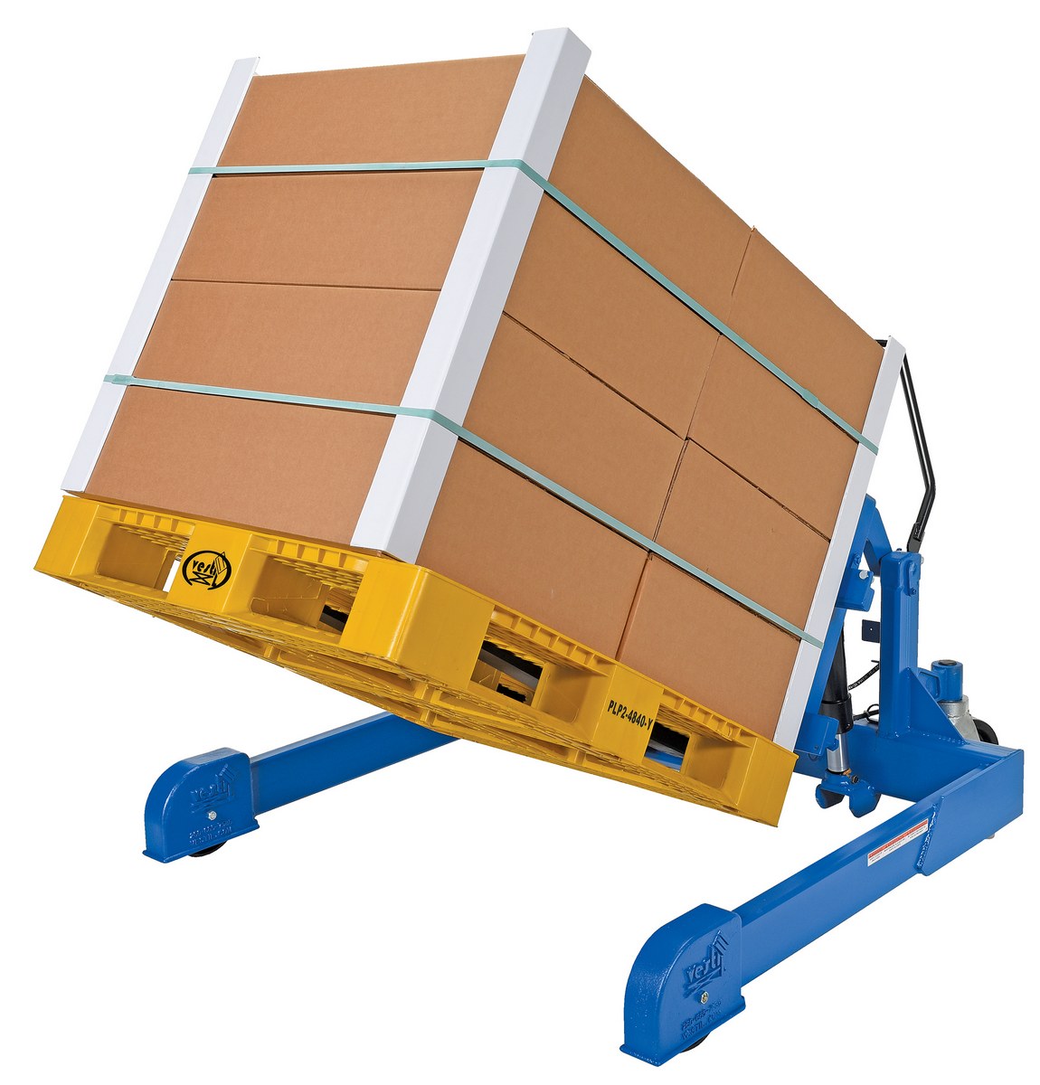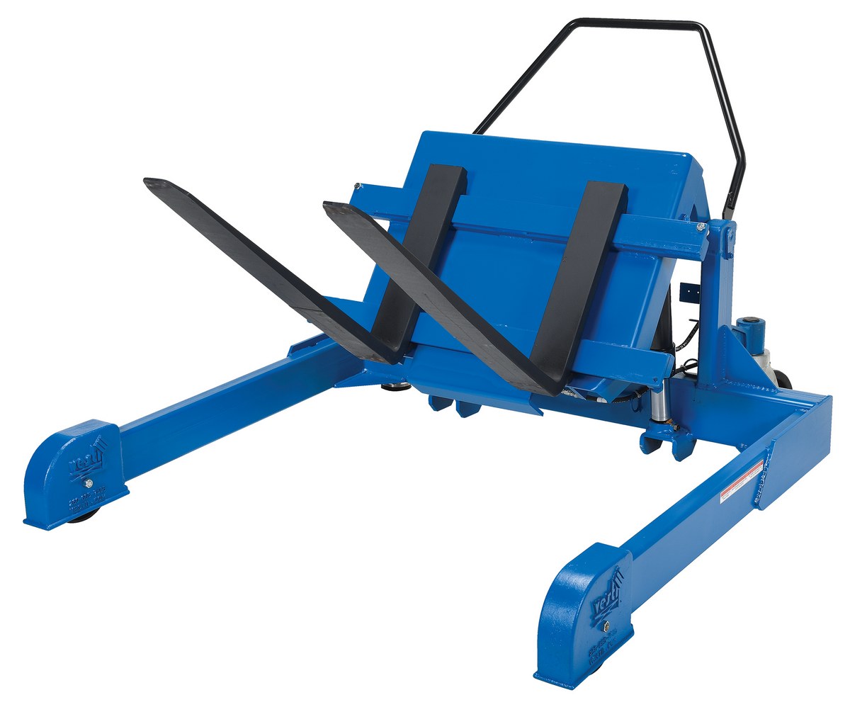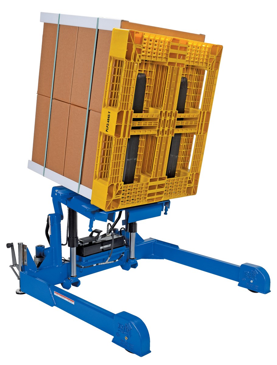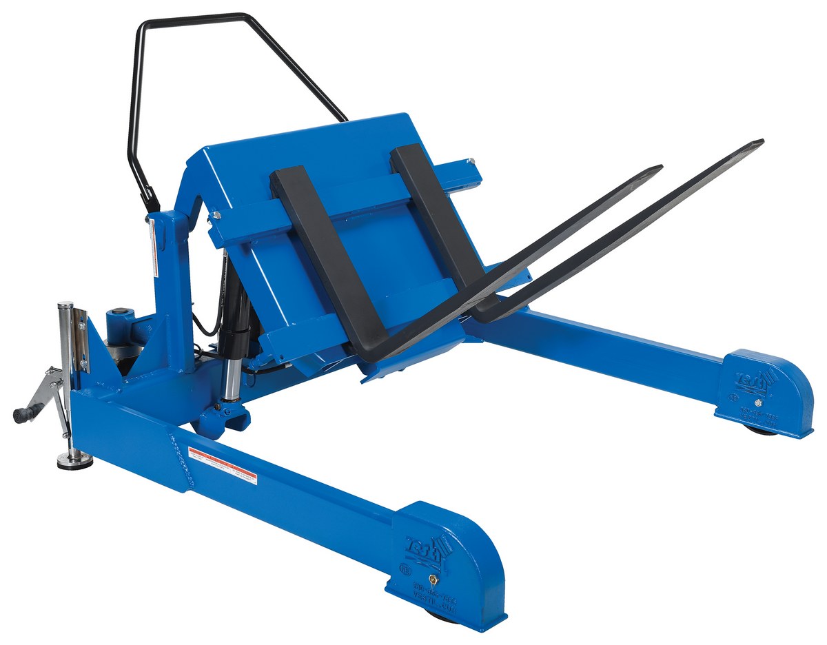 Steel Tilt Master Straddle Reciprocating Air/Oil Power 2,000 Lb. Capacity BlueThe tilt master straddle lifts and positions filled tote boxes or baskets without the need of a fork truck or lift table using the newly designed heavy-duty tilt master. The tilter will function as transporters by moving completed products from work station to work station without waiting for a fork truck. This lift has a thin profile to allow the user to get as close to the load as possible. It also has a standard floor lock and rolls easily on the phenolic steering wheels. Lift is designed to be used with virtually any kind of container or pallet. The unit is powered by an air pneumatic motor.