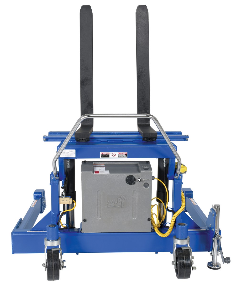 Steel Tilt Master Straddle DC Powered 12 Volt 4,000 Lb. Capacity BlueThe tilt master straddle lifts and positions filled tote boxes or baskets without the need of a fork truck or lift table using the newly designed heavy-duty tilt master. The tilter will function as transporters by moving completed products from work station to work station without waiting for a fork truck. This lift has a thin profile to allow the user to get as close to the load as possible. It also has a standard floor lock and rolls easily on the phenolic steering wheels. Lift is designed to be used with virtually any kind of container or pallet. The unit is powered by a DC electric motor that includes an on-board battery charger and battery charge indicator.