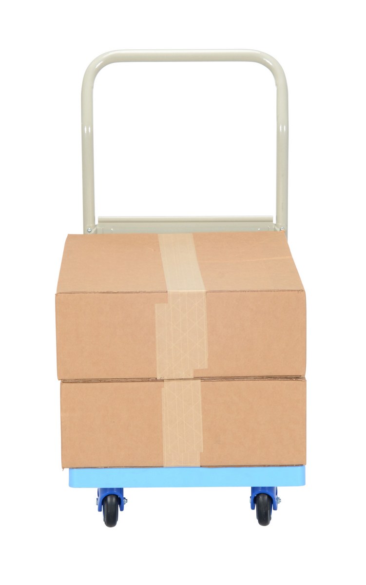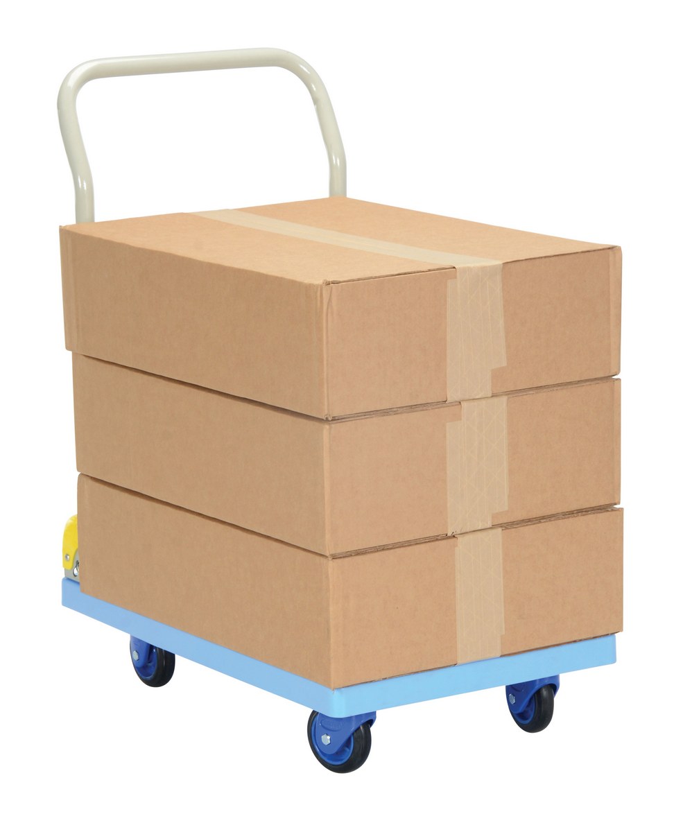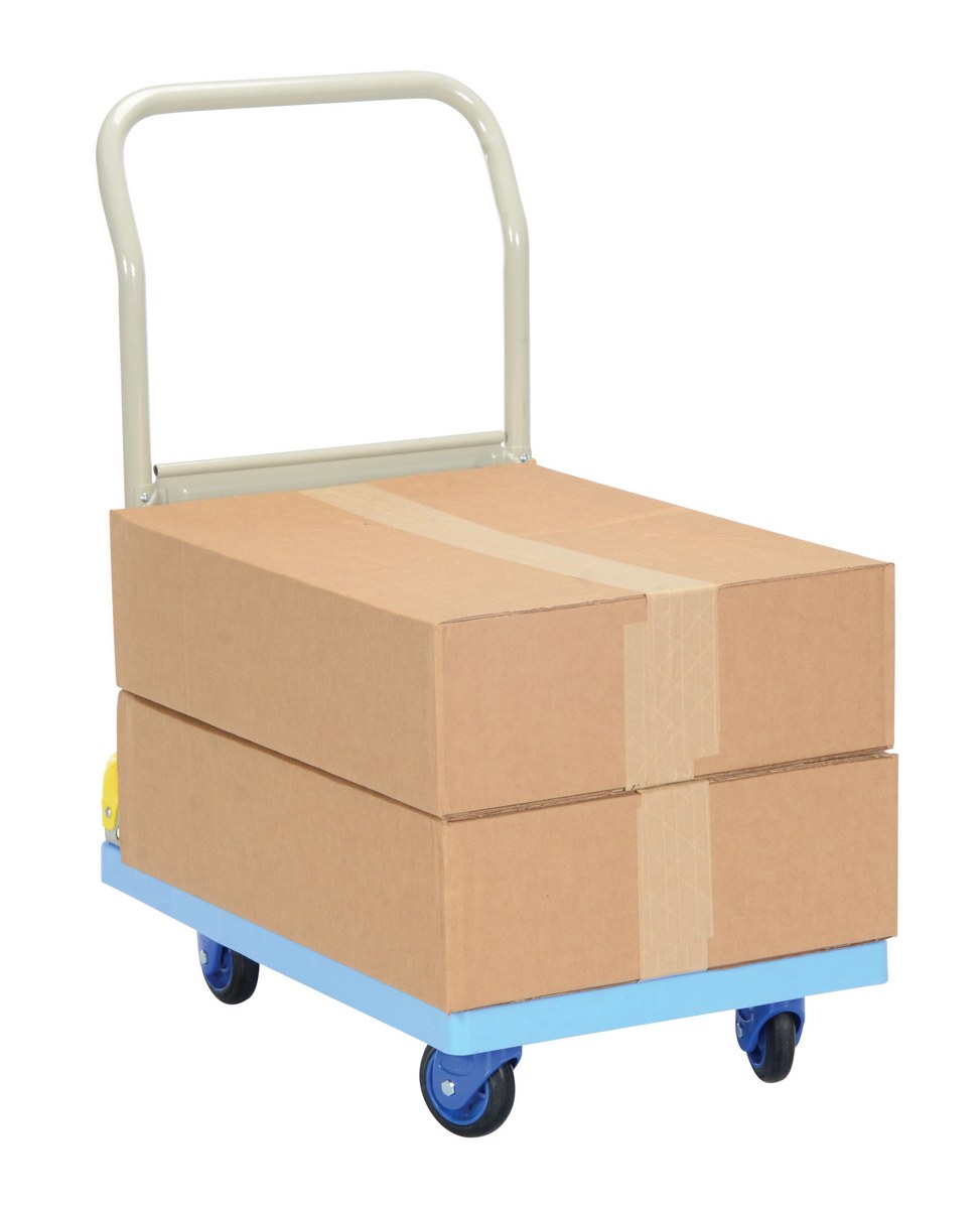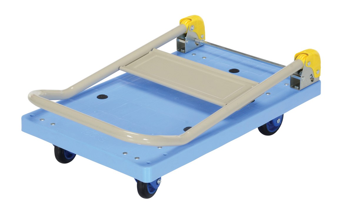 Plastic Truck Folding Handle 27-7/8 In. x 17-7/8 In. x 34 In. 330 Lb. Capacity BlueThe plastic platform cart is a great addition to the shipping and distributing facilities. The plastic platform creates a durable, yet lightweight construction that can be transferred simply from workstation to workstation. The unit rolls on casters for smooth transference over a variety of terrains. The attached handle creates a more ergonomic posture of personnel during use.