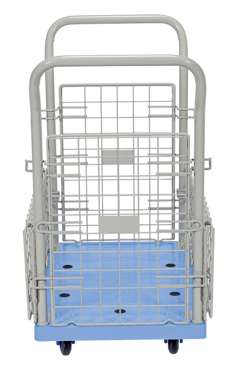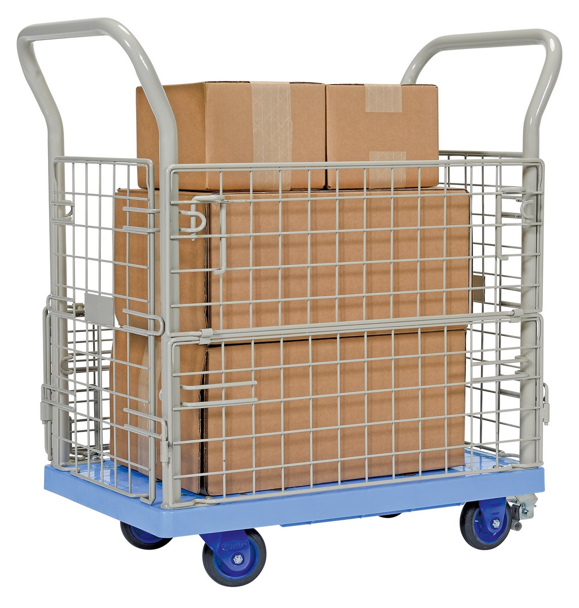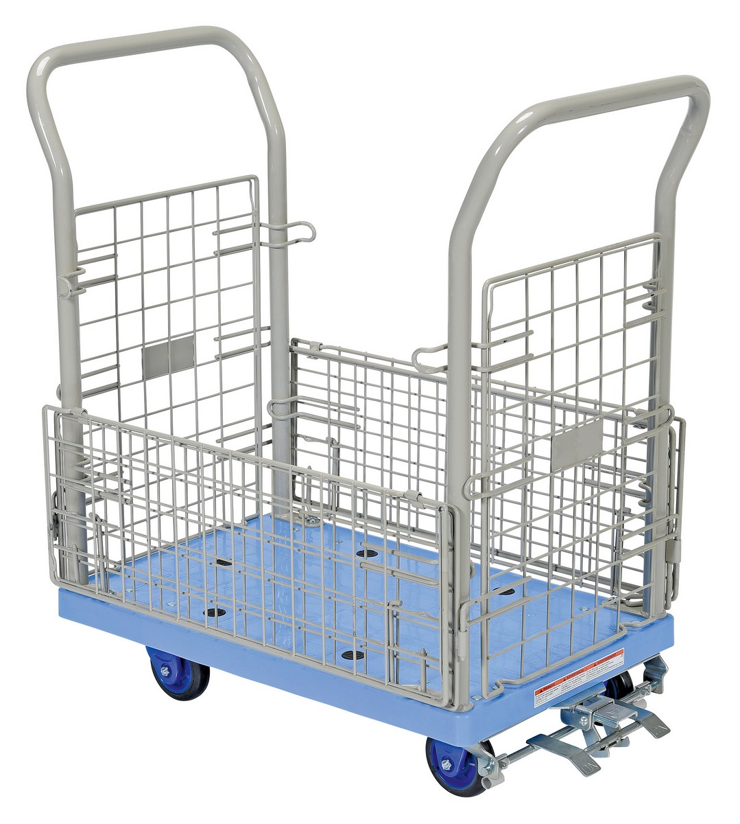 Plastic Truck Mesh Sides with Floor Brake 36-1/4 In. x 20 In. x 33-1/2 In. 330 Lb. Capacity BlueThe plastic platform cart is a great addition to the shipping and distributing facilities. The plastic platform creates a durable, yet lightweight construction that can be transferred simply from workstation to workstation. The unit rolls on casters for smooth transference over a variety of terrains, while the side nets enable the utmost security. The attached handle creates a more ergonomic posture of personnel during use, while the brake keeps the unit steady when not in progress.