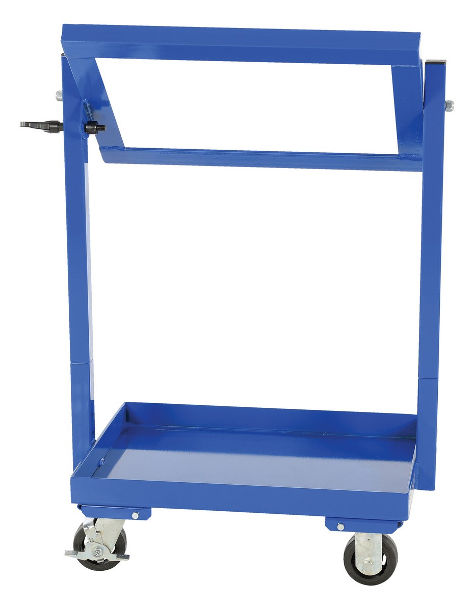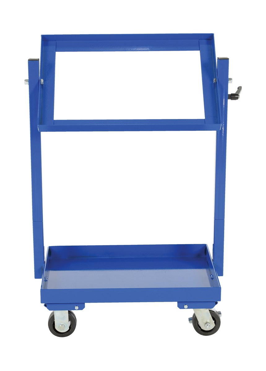 Steel Multi-Tier Cart with 2 Shelves 200 Lb. Static Capacity BlueThis unique multi-tier stock cart makes it easy to organize and reach parts. Tilting shelf allows easy access to baskets. Ideal for stocking parts in work stations. Casters allow the parts to be moved to wherever they are needed. Shelf angle is locked with a single handle design easier on the hands and allows user to apply more torque for a tight grip, handle is also "indexable" allowing for operation similar to a ratchet. Shelves include a lip on all four sides. The vertical uprights knock-down for more convenient shipping and storage. Overall cart size does not include baskets. Rolls smoothly on casters. Steel construction with a powder coat finish. Baskets not included.