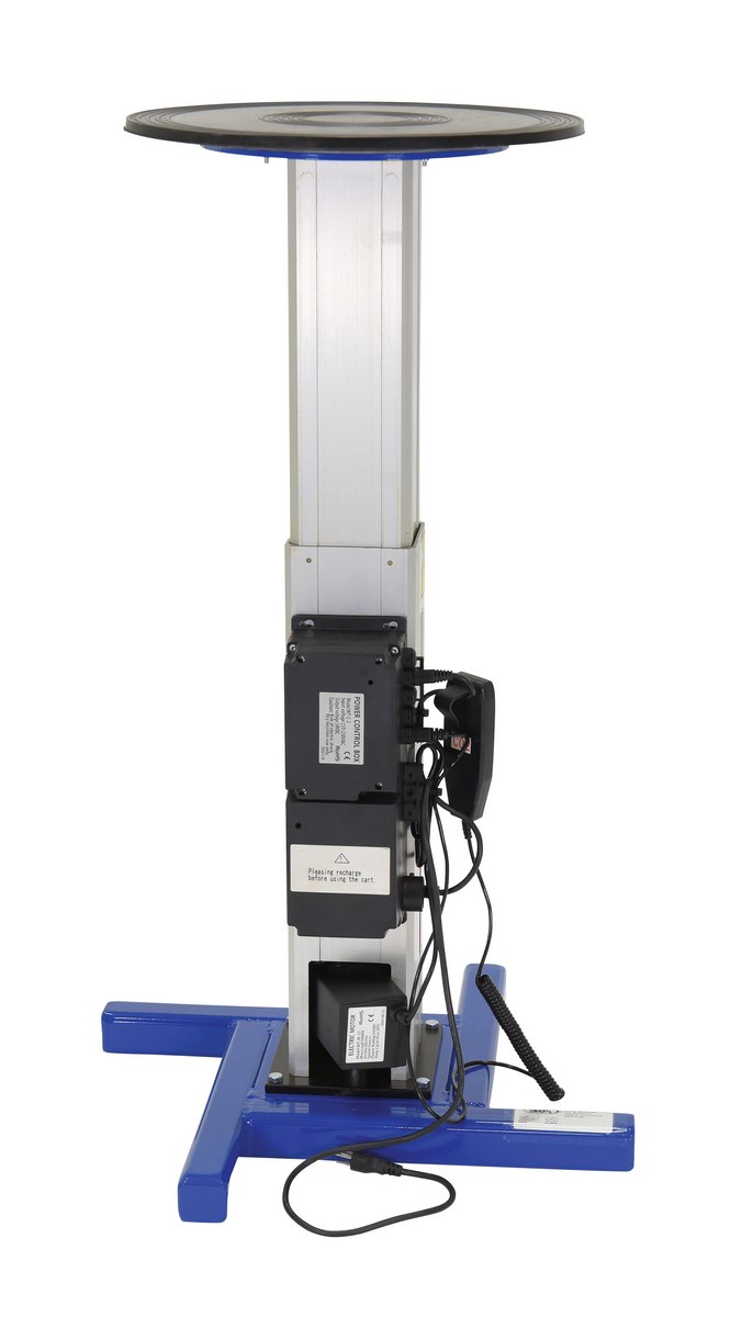Steel Turntable 18 In. Diameter DC Powered 27-43 In. Height Adjustment 24V 750 Lb. Capacity BlueThe turntable with powered height adjustment allows the operator to raise or lower turntable to an ergonomic height. This unit has a manual turntable and is DC powered with hand control for height adjustment. Hand held pendant control connects to power unit with a coil cord. Height is adjusted with an electric linear-actuator.
