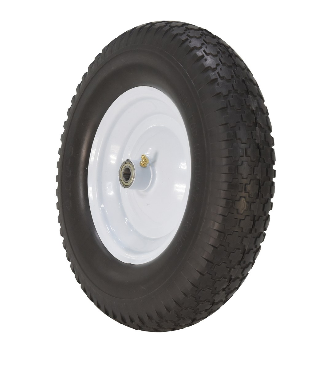 Polyurethane Solid Foam Wheel 16 In. Diameter x 4 In. Width 300 Lb. Capacity BlackThis wheel is made of polyurethane, which has a greater load-bearing capacity than rubber. These won't puncture or go flat and are resistant to corrosion and wear. The sawtooth tread pattern provides traction. This wheel is intended for use in professional and industrial environments.