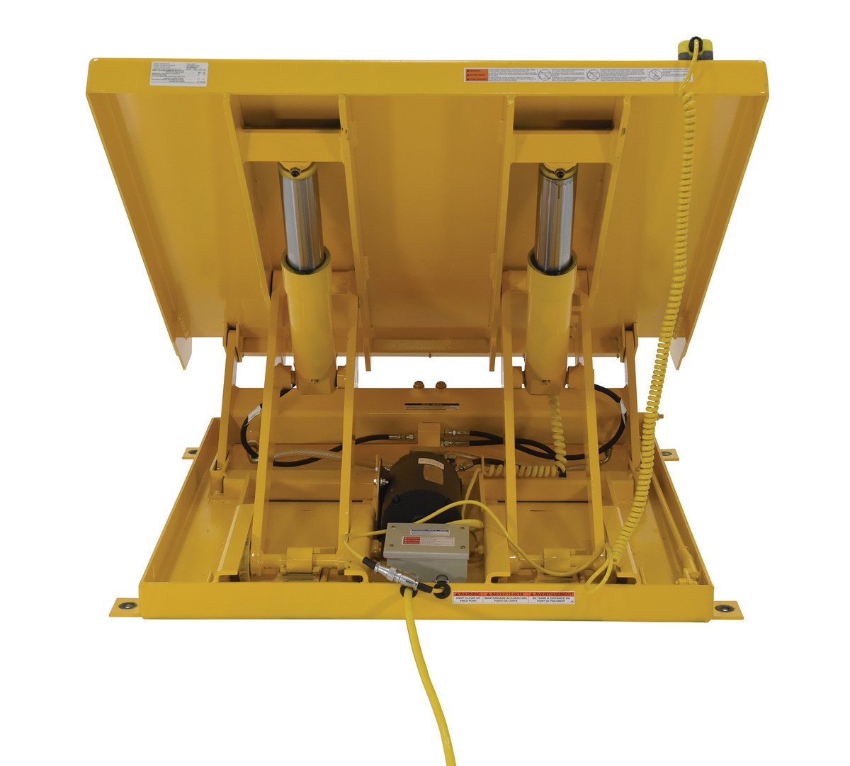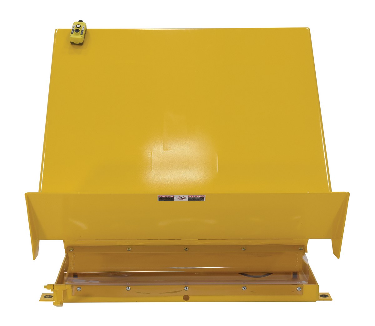 Steel Lift Table 48 In x 48 In AC Powered 460 Volt 3 Phase 6,000 Lb. Capacity YellowThe single scissor lift & tilt table is designed to position containers within easy reach of assembly line workers and machine operators. The unique design reduces fatigue by minimizing repetitive bending and stretching required to obtain components from containers. This scissor table comes with a high lip on the tilt side which makes it ideal for parts transfer and assembly. The selector pedal allows the operator to lift while tilting, or tilt then lift. The motor is totally enclosed standard with optional voltages available. Other standard features include: a two-button handheld control, integrated maintenance lock, pressure plated pump, pressure compensated flow valve, lowering valve, independent oil return, and an adjustable upward travel switch. Scissor table must be lagged to the floor.