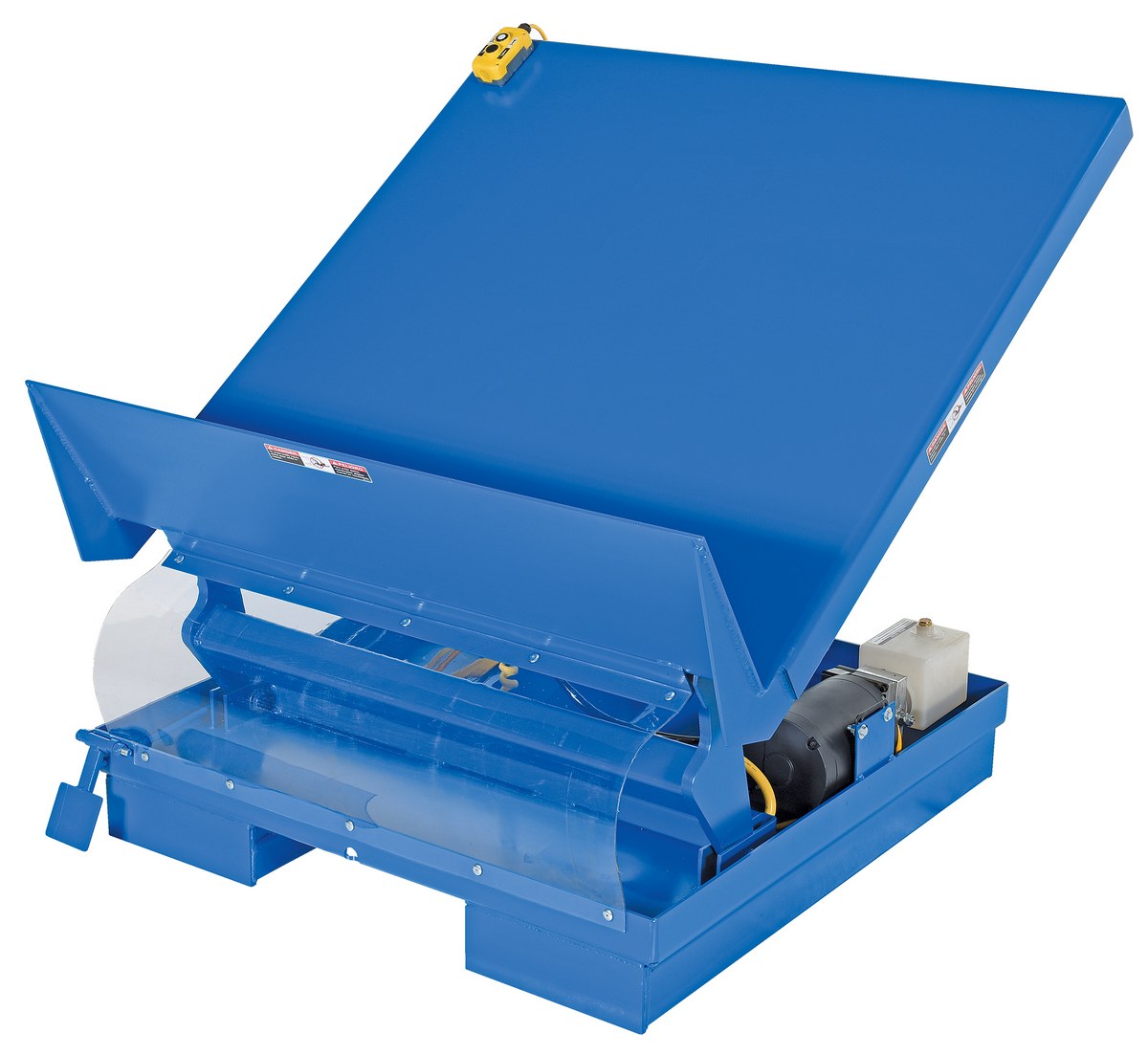 Steel Fork Truck Portable Uni-Tilt 48 In x 48 In 460 Volt 3 Phase 4,000 Lb. Capacity BlueThe portable Uni-Tilt can transport your tilter from workstation to workstation quickly and easily with a fork truck. The unique design reduces fatigue by minimizing repetitive bending and stretching required to obtain components from containers. The platform has a high lip the tilt side and a selector pedal that allows the operator to lift while tilting or tilt then lift. The unit has a hand pendant control standard and optional voltages available.