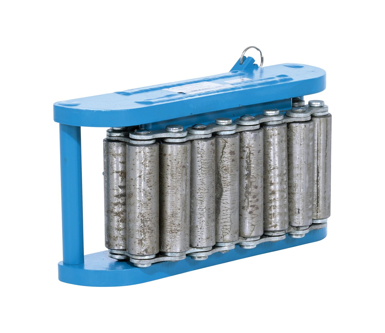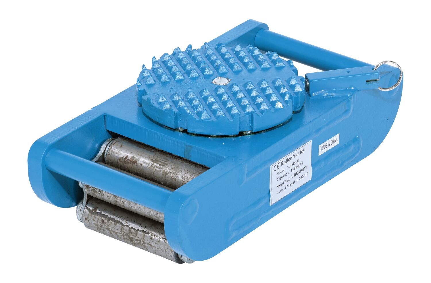 Steel Machine Roller 33,000 Lb. Capacity BlueMade of high-strength annealed ductile iron, this steel machine roller has swivel tops that rotate three hundred sixty degrees (360 degrees) on chrome steel ball bearings to allow for easier turning. The rollers form a "tank track" to revolve around a center load bearing plate in the frame to provide maximum maneuverability. The weight of the load is transferred directly from the load bearing plate to the rollers, eliminating axle friction and requiring less power to start and move. This unit is virtually maintenance free.