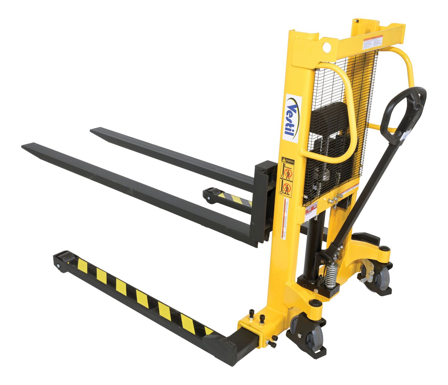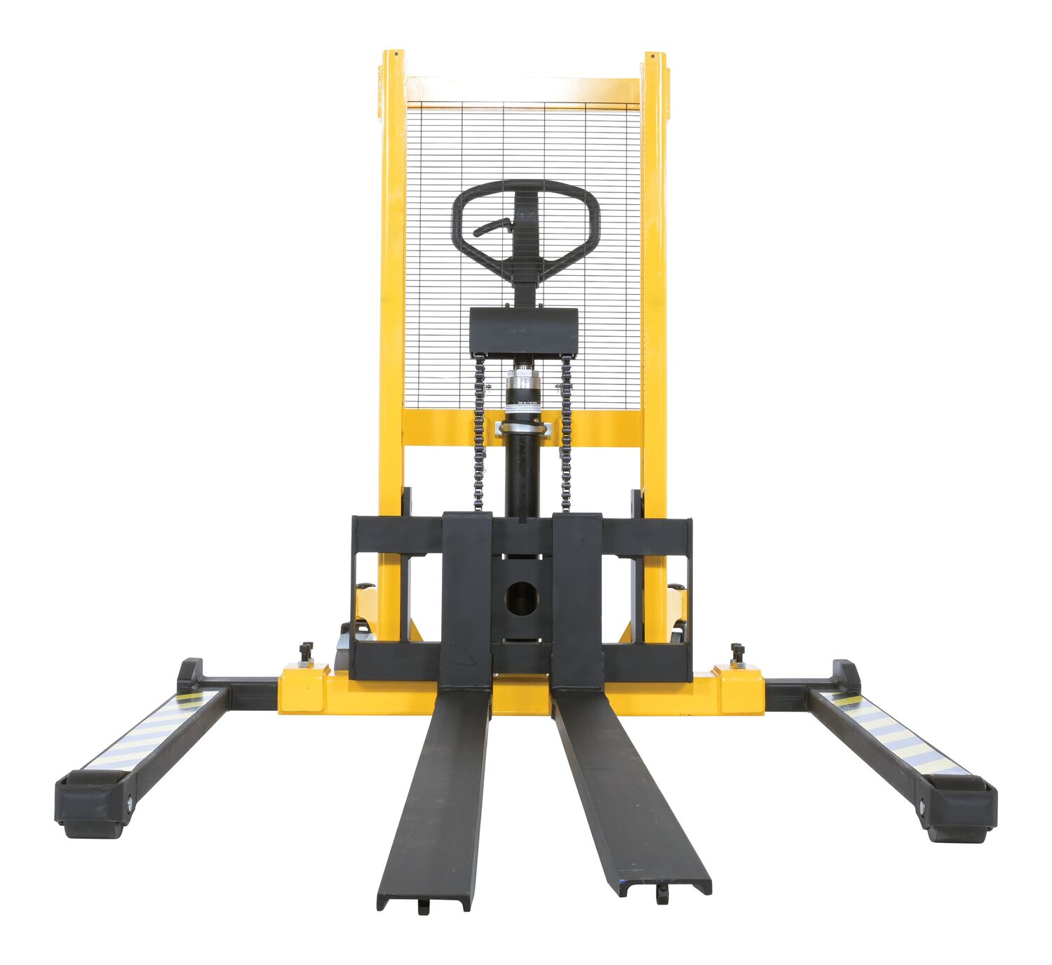 Steel Manual Stacker Adjustable Forks/Legs 550 Lb. Capacity Black / YellowThe manual stacker is designed to meet the most challenging tasks. Ideal for use in various workstation and workplace applications. The full height push handle allows for easy steering and excellent visibility through a welded mesh guard with an optional removable platform also available. It features a heavy-duty mast and a unique winch design for easier and safer lifting. The lifting and lowering is completed by a manual hand pump operation.