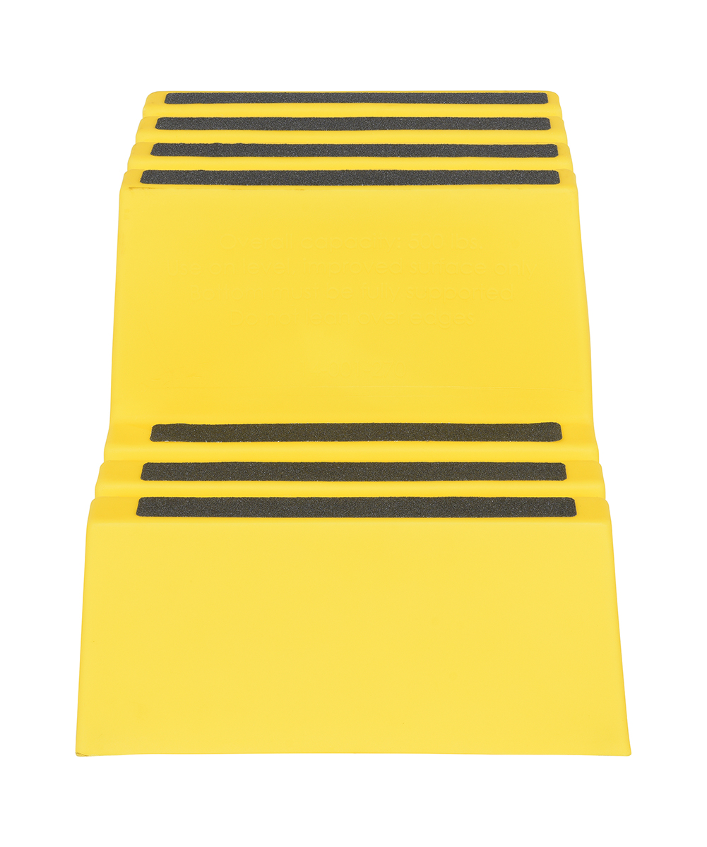 Polyethylene 2-Step Step Stool 500 Lb. Capacity YellowWhen items are out of reach, do not strain, simply step up with this Polyethylene step stool. The two (2) step unit has rear opening access storage compartments. This stool has rubber feet and a non-skid tape surface. Hand holes are standard for easy one person transportation.
