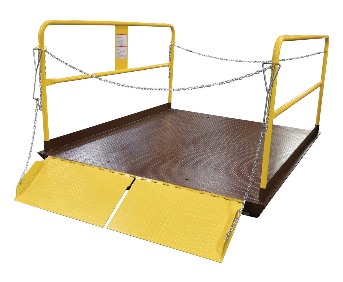 Save time and reduce man-hours where there are no docks with a truck scissor dock lift. Engineered and designed for maximum safety and efficiency. The diamond plate deck is made of heavy gauge steel for years of use. Hydraulic cylinders feature safety velocity fuse if line breaks. It comes complete with upper travel limit switch and overload relief valve. The push-button control is on a long coil cord. Pre-wired control box includes magnetic starter and overload fuse. High visibility safety yellow removable handrails with fixed toe boards are standard. Includes beveled toe-guards and electric toe-guards around perimeter of platform. The external motor can be located up to eight (8) feet away from lift.